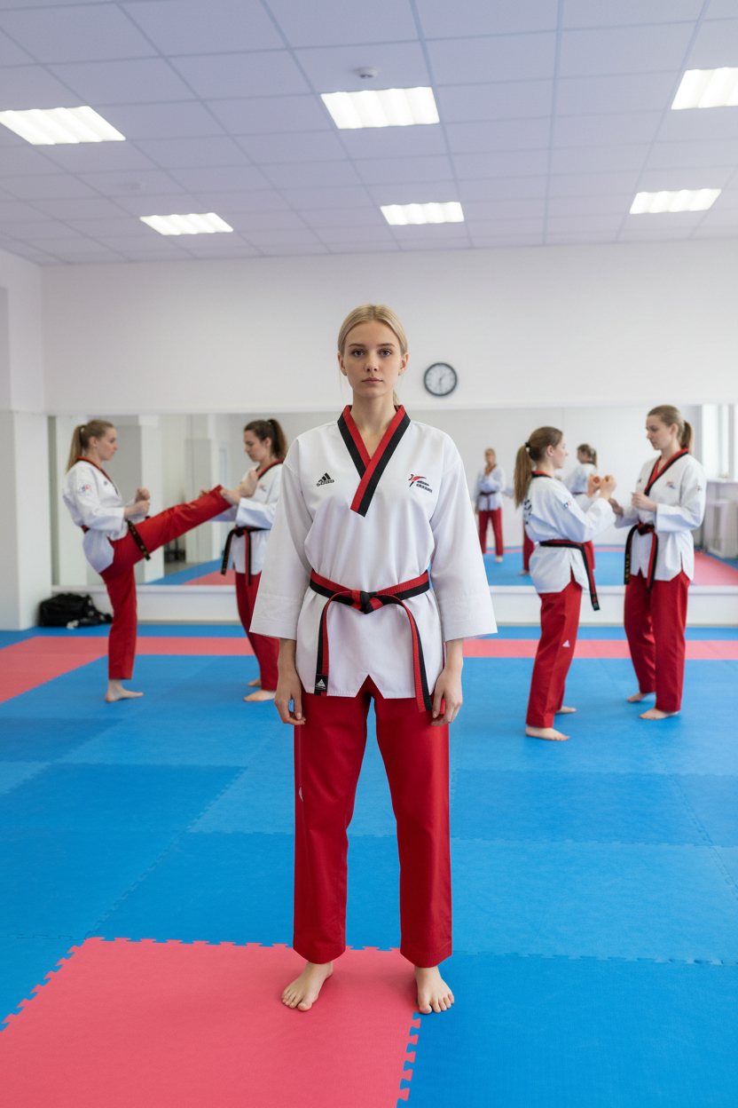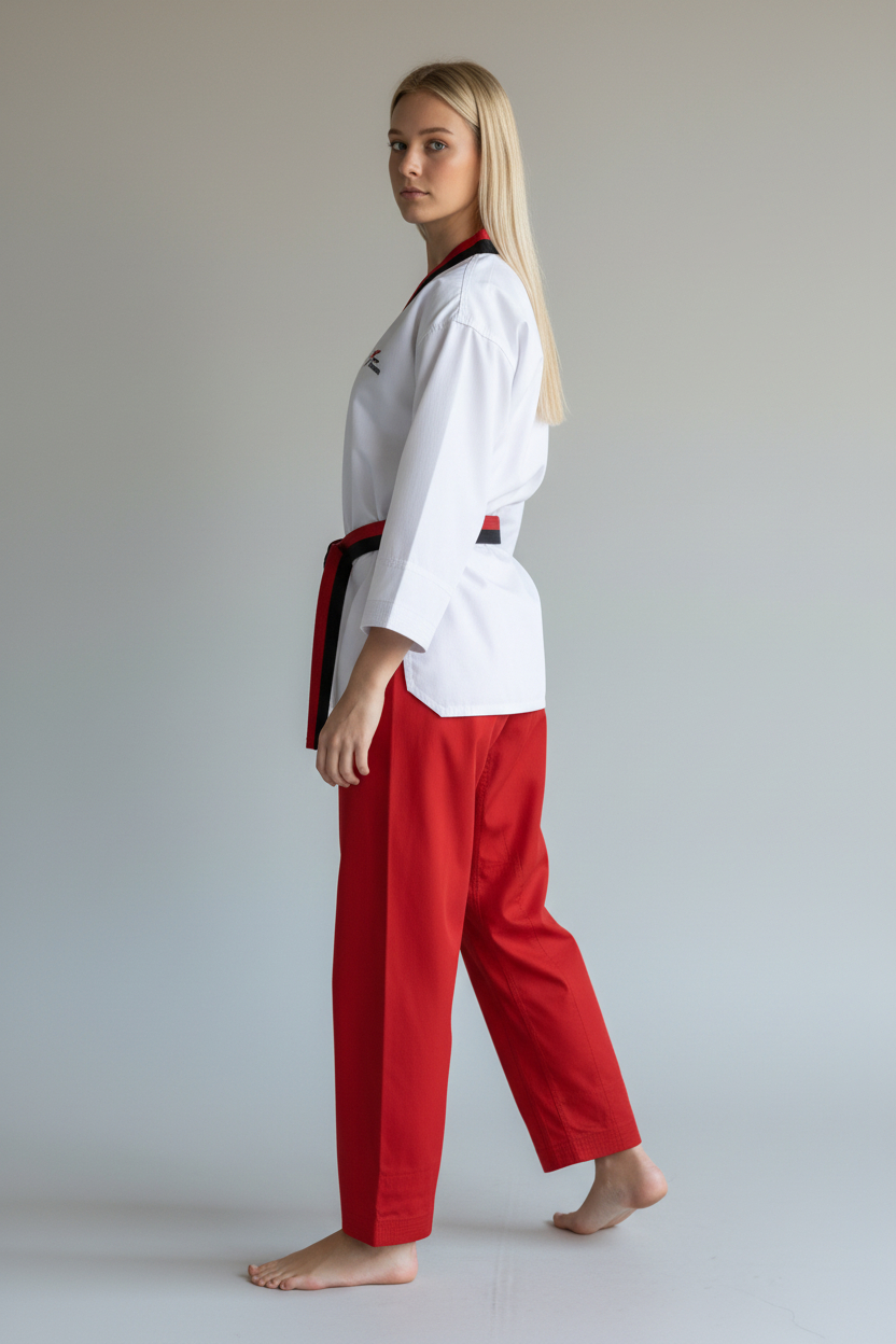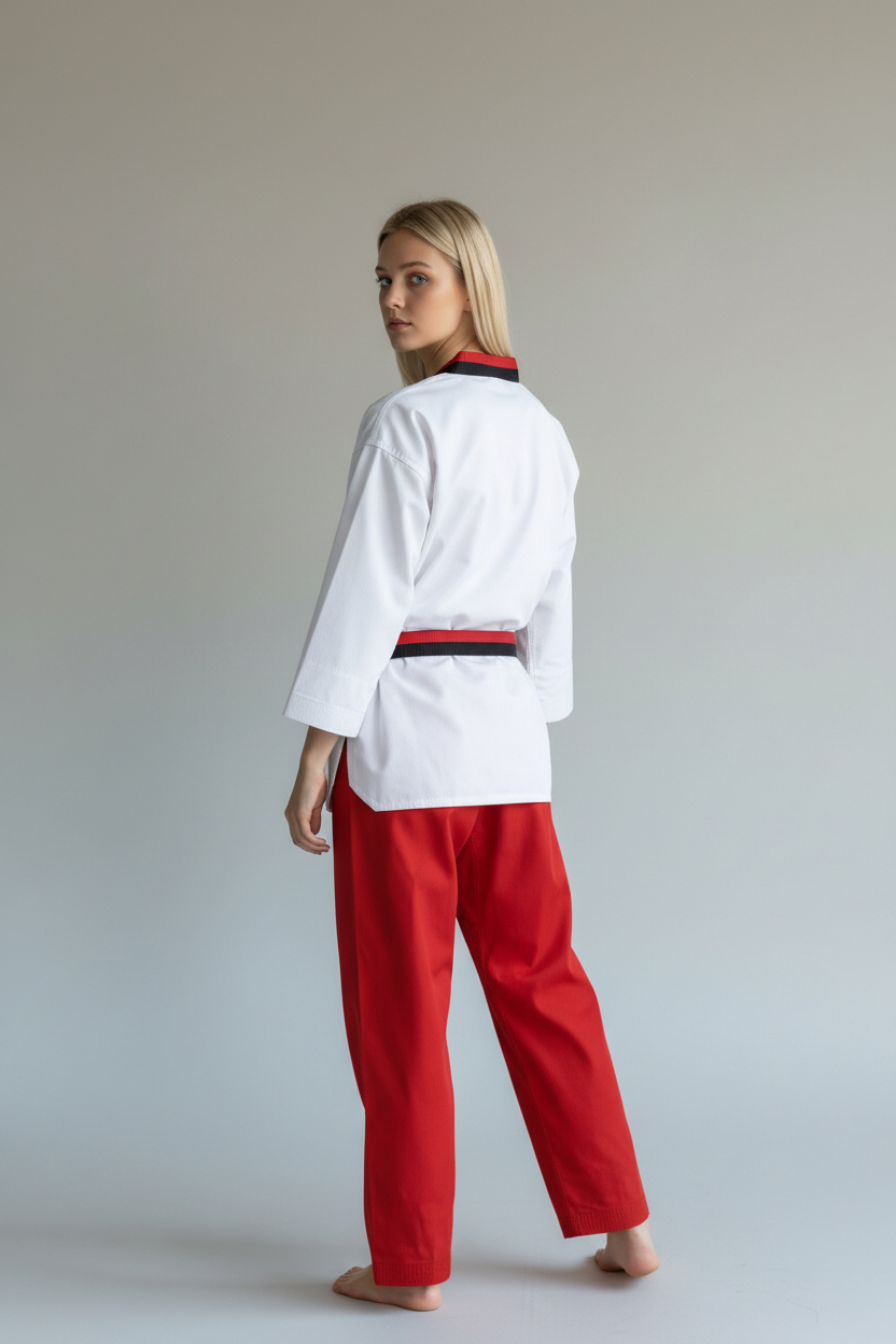 Este modelo está diseñado para mujeres que buscan un dobok que combine estética + precisión + comodidad.